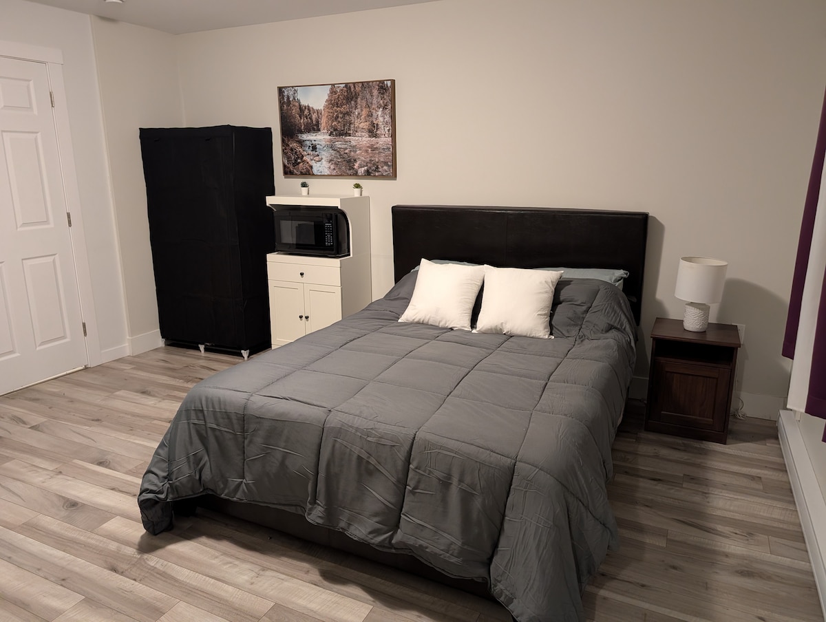 Kick back, reminisce and relax in this calm, stylish space. This basement apartment in South Bedford offers the most important amenities with class. The open concept sitting area is nestled between the dinning and equipped kitchenette. The bedroom offers a comfy king-sized bed, a working area, a dresser and a nightstand. The toilet is equipped with both automatic sensors and energy-efficient flushing mechanism. Finally, a heat pump helps moderate temperatures within the apartment all year round.