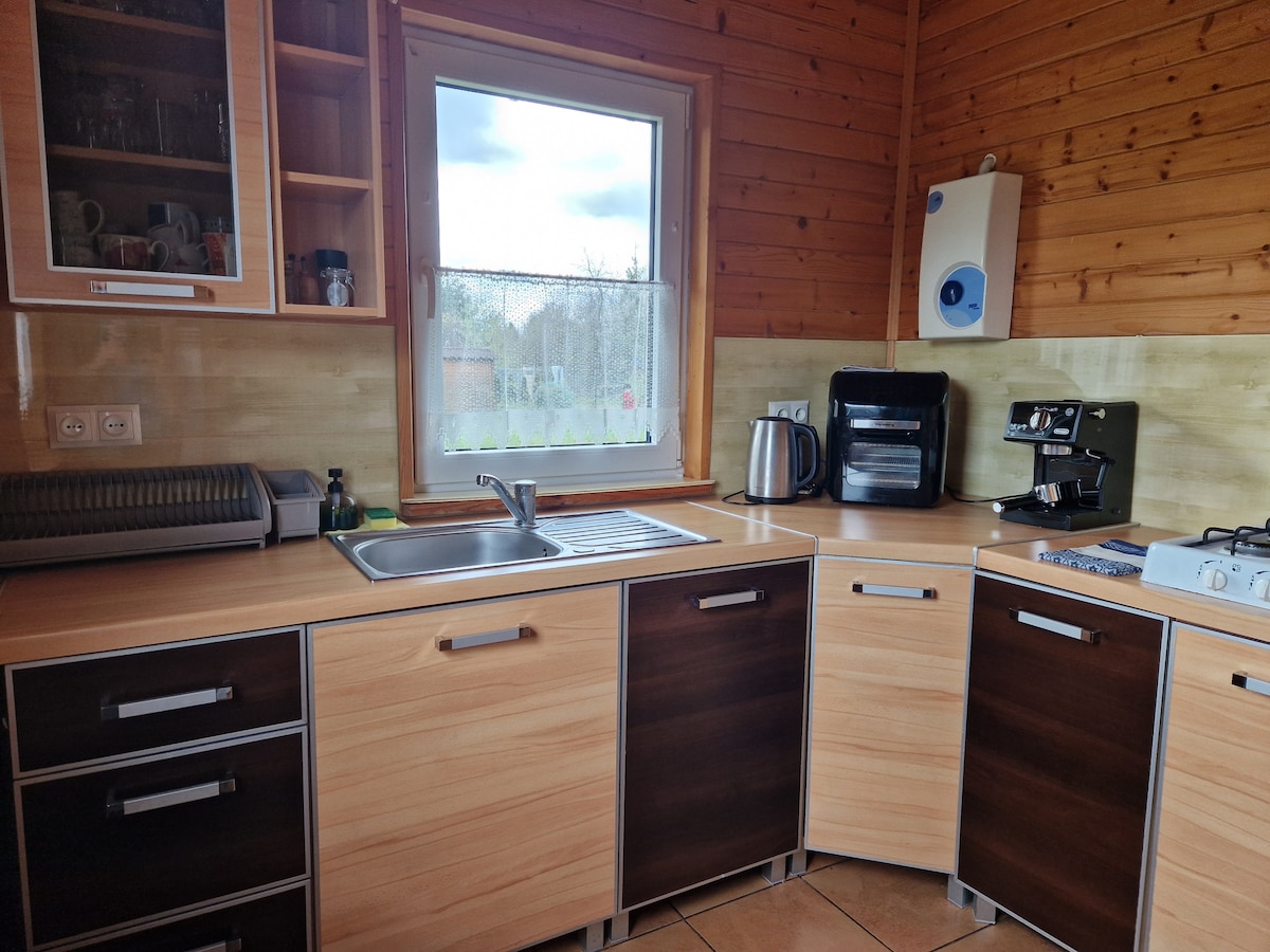 Zanurz się w naturze w designerskim domku na dużej, ogrodzonej działce (15 000 m²), bez sąsiadów. Czeka na Ciebie łóżko King Size, pachnące drewnem wnętrza, przytulny kominek i klimatyzacja. Pełne wyposażenie: ekspresy do kawy (aeropress, chemex, kawiarka), szybki internet (200 Mbps), aneks kuchenny, duży taras, miejsce na ognisko i grill. Ekologiczne kosmetyki i miękkie ręczniki w cenie. Domek przeznaczony wyłącznie dla dorosłych gości.