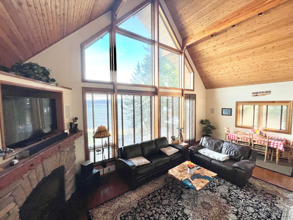 鄉村風格的舒適小木屋。開放式設計,可輕鬆娛樂,欣賞壯麗的水景。 主樓層臥室配有標準雙人牀,以及配有標準雙人牀的開放式閣樓 小木屋在樓下臥室對面有一間浴室。 非常好的室外生活,有兩個甲板;前甲板面向海邊。 使用樓梯進入海灘和船屋,船屋內有兩艘單人皮劃艇、一艘雙人皮劃艇、救生衣和供房客使用的海灘椅。 有一個室外閉路電視,監控車道。