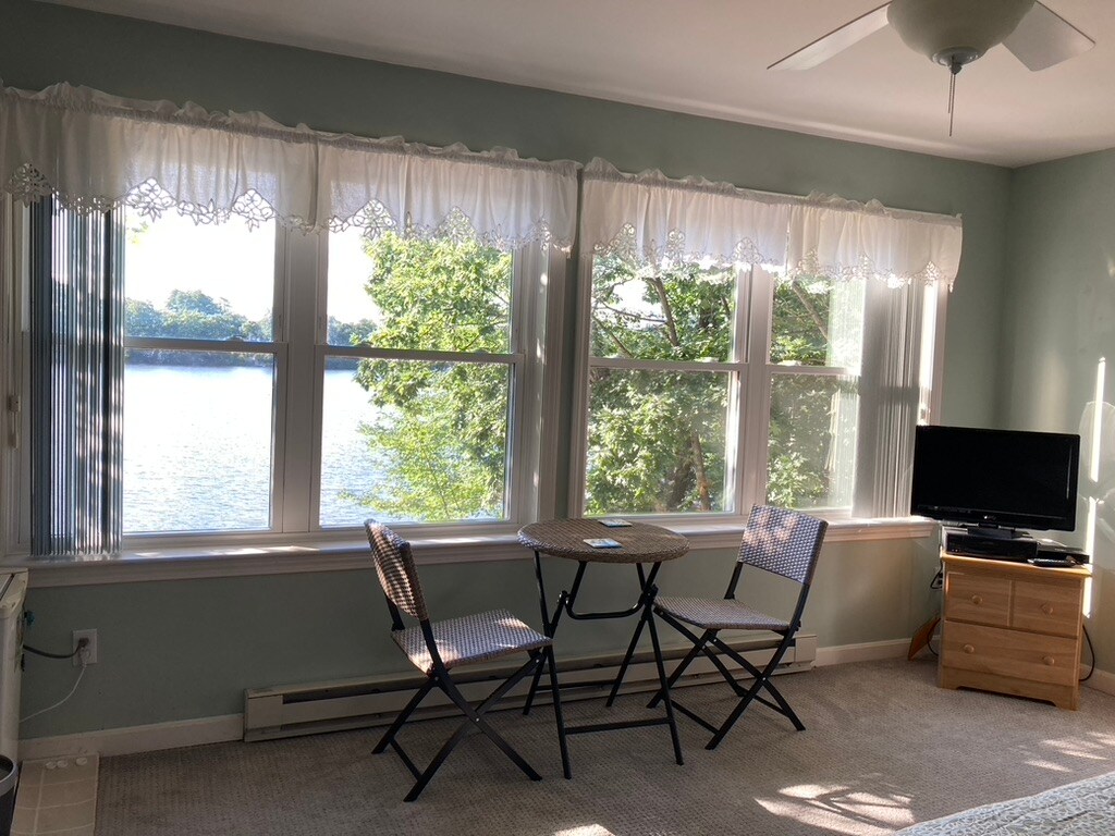 Spacious second floor bedroom with private bathroom, and sitting room. Near area colleges. On-site parking, separate entrance, overlooking lovely New England lake. Located on quiet side street near area colleges, shopping and restaurants. Enjoy local cultural and and sports events. For safety reasons, we do not offer water access, but there is a town beach right next door if you want to swim or rent a paddle boat, or fish from that shoreline. Guests are welcome to relax on our beachfront.