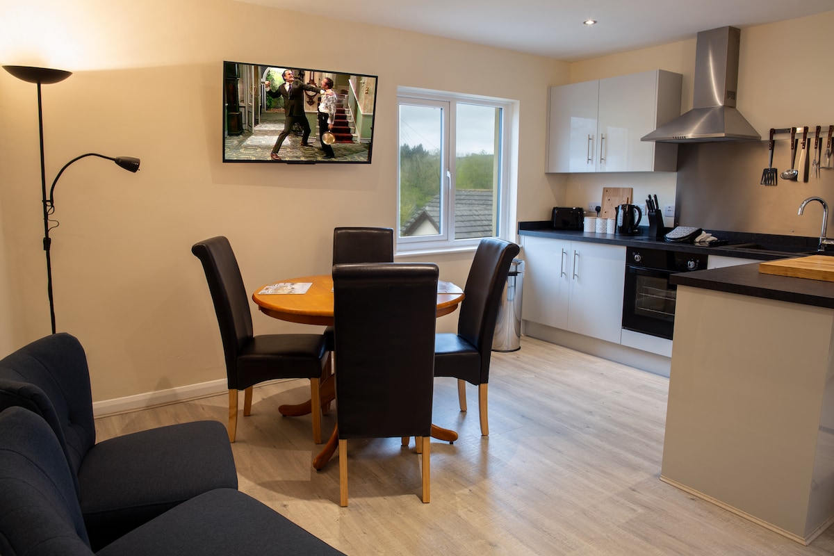 這個古樸的獨立谷倉充滿特色和寧靜(沒有WIFI )。 有一個開放式廚房/起居區,配有溫馨的燃木爐(木材價格為每網7英鎊現金)和石板頂早餐吧。 除了浴室裡的石板外,整個房源都有堅固的橡木地板,所以別忘了拖鞋! 廚房包括烤箱、爐竈、冰箱冷凍庫、烤麵包機、微波爐和水壺。 舒適的起居區通往迷人的露臺和草地區域。抱歉,禁止攜帶寵物
