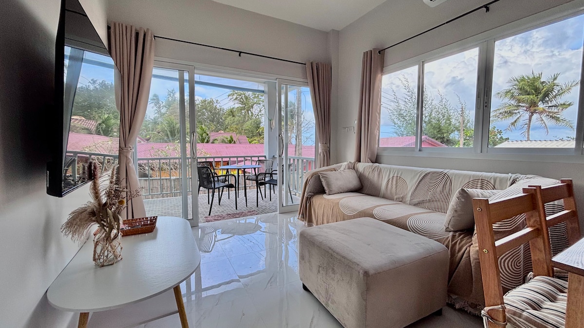 Kick back and relax in this calm, stylish space. Located steps from the beautiful shores of Chaloklum Bay, Koh Phangan, an area known for its rich local culture, fresh-off-the-boat seafood, crystal clear seawater and white sandy beach. This 1 bedroom top floor apartment comes with a private deck overlooking the blue seascape, a fully equipped kitchen, king bed, cozy living room, outdoor shower, indoor/outdoor dining and high-speed wifi. This newly renovated gem is what you've been looking for.