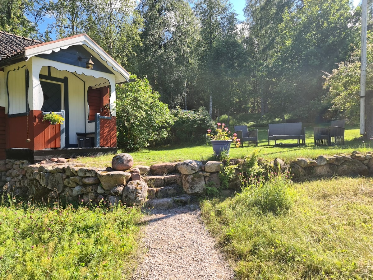 Bo i en liten röd stuga med vita knutar på en gammal dalagård i den vackra byn Hedby. Stuganbestår av 2 rum o kök samt ett litet badrum. Huset är fullt utrustad och anpassat för 2 personer. Det finns ett litet rum med en säng på 160cm samt 2 soffor som man kan sova på om man tar bort kuddarna o lägger en tunn madrass på då blir de 80 cm. De är inte utdragbara. Lakan finns att hyra. Utanför finns en liten stenlagd privat uteplats med trädgårdsmöbler där man hör bäckens porlande. Huset ligger avgränsat från värdfolket mellan två bäckar. Stugan ligger nära vandringsleder, cykleder samt små badsjöar.