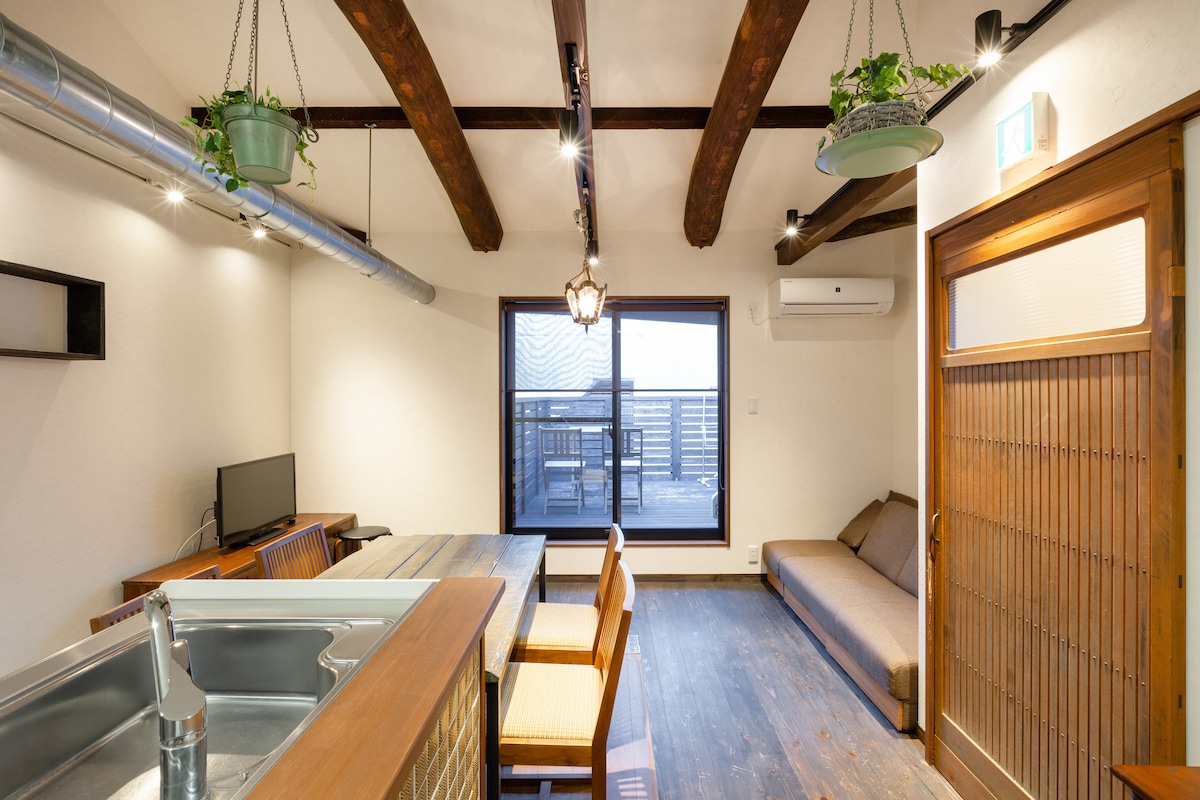 NIMON的1號房間「KAI」是一間舒適的現代化公寓。 公寓特別漂亮,因為它朝南,所以房間光線充足。 臥室在樓上。 這個房間的一個值得注意的特色是臥室照明。 當您打開臥室燈光時,天花板上有很多閃閃發光的燈光,就像美麗的星空一樣。 我們提供舒適獨特的體驗,融合了京都傳統和現代設計。