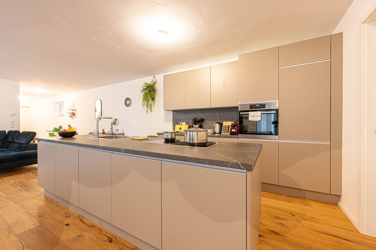 Welcome to LIT Living in the beautiful old town of Hemsbach! Our newly built connecting building with ground floor apartment offers you everything you need for a wonderful stay. Here you will find among other things: → Super central → 2 bedrooms with king size box spring beds → Large 58" Smart-TV with NETFLIX → A designer sleeper sofa & an exclusive swing. → NESPRESSO coffee & country tea → A high quality kitchen with AEG appliances and kitchen island.