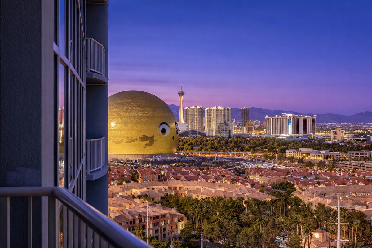 令人驚嘆的景觀!現代頂層套房,配有私人陽臺和Strip & Sphere的美景。 靠近會議中心。 塔樓與MGM Grand、Arena、賭場、單軌電車站相連。 您有權免費使用所有米高梅度假村設施、遊泳池、健身房、商務中心,包括免費使用Lazy River。 套房配有小廚房、有線電視、WIFI。 花崗巖浴室配有豪華漩渦水療浴缸/按摩浴缸和獨立淋浴間。 無度假村費用。免費代客泊車