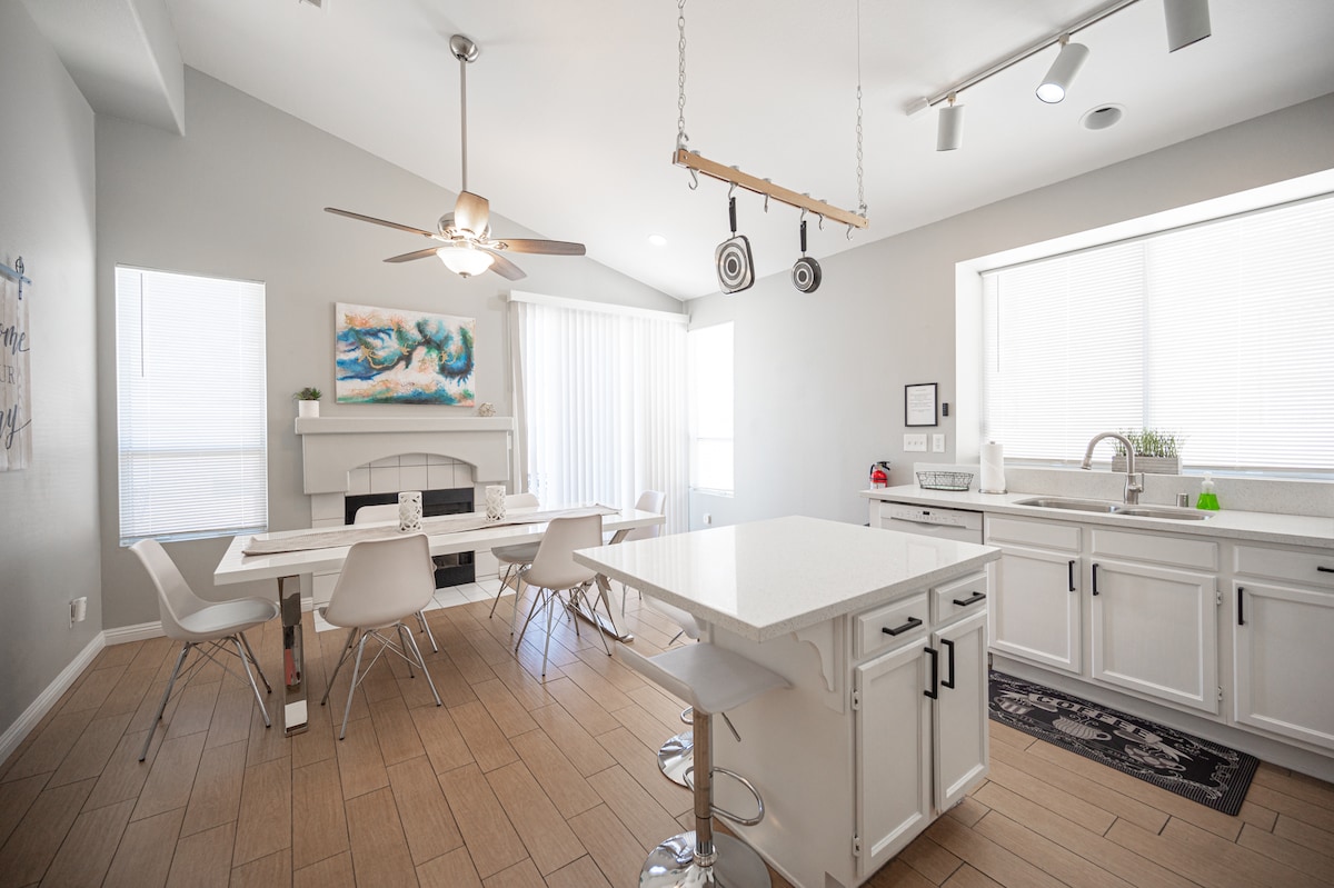 The beautiful 3-story home is 1 bedrooms , 1.5 bathrooms and with a den downstairs . The den room has a pool table . There are ceiling fans throughout the house. The upstairs primary room windows offer a rare wide strip view. There is the queen-size bed and TV in the bedroom . Additionally, there's a separate dining area with a kitchen combo featuring granite countertops.