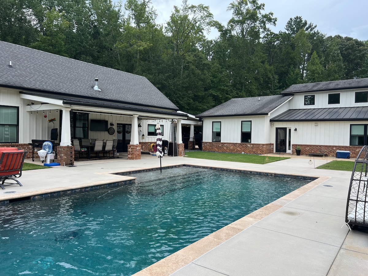 Welcome to your farmhouse retreat on 7.5 acres of peaceful Georgia countryside. Enjoy designer interiors with rustic charm, a sparkling pool, and private walking trails perfect for morning strolls or sunset views - all just five minutes from Tanger Outlets for brand-name shopping and Planter’s Walk Antique Mall for unique vintage treasures. 🏊♀️ Seasonal Pool Access Guests can enjoy the saltwater pool during the warmer months—typically open from May 25 through September 7.