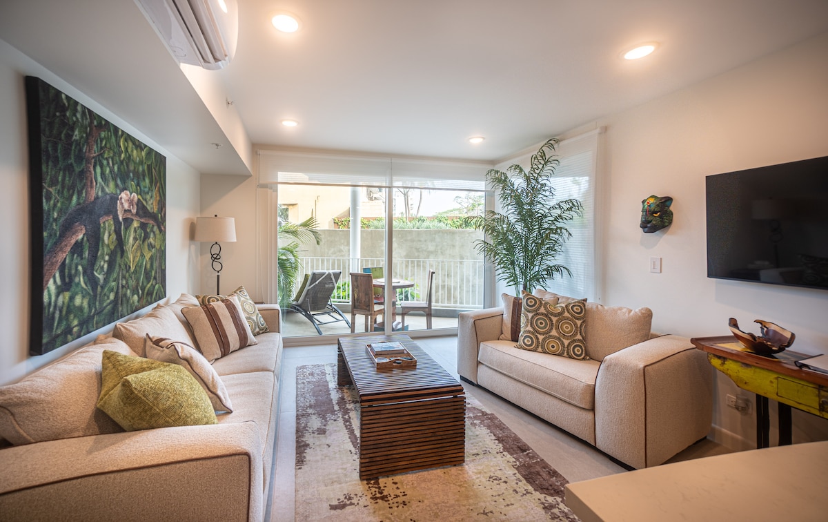 在我們全新、設備齊全且時尚的2間臥室和2間浴室公寓中放鬆身心,步行僅需5分鐘即可抵達海灘。 位於Jacó一個安靜的街區,但距離Jacó的所有充滿活力的購物和餐飲都很近。 在主套房享受舒適的加大雙人牀,在第二間臥室享受一張加大雙人牀。 兩間臥室均配有空調、吊扇、衣物儲物空間和可收看240個頻道的智慧電視。