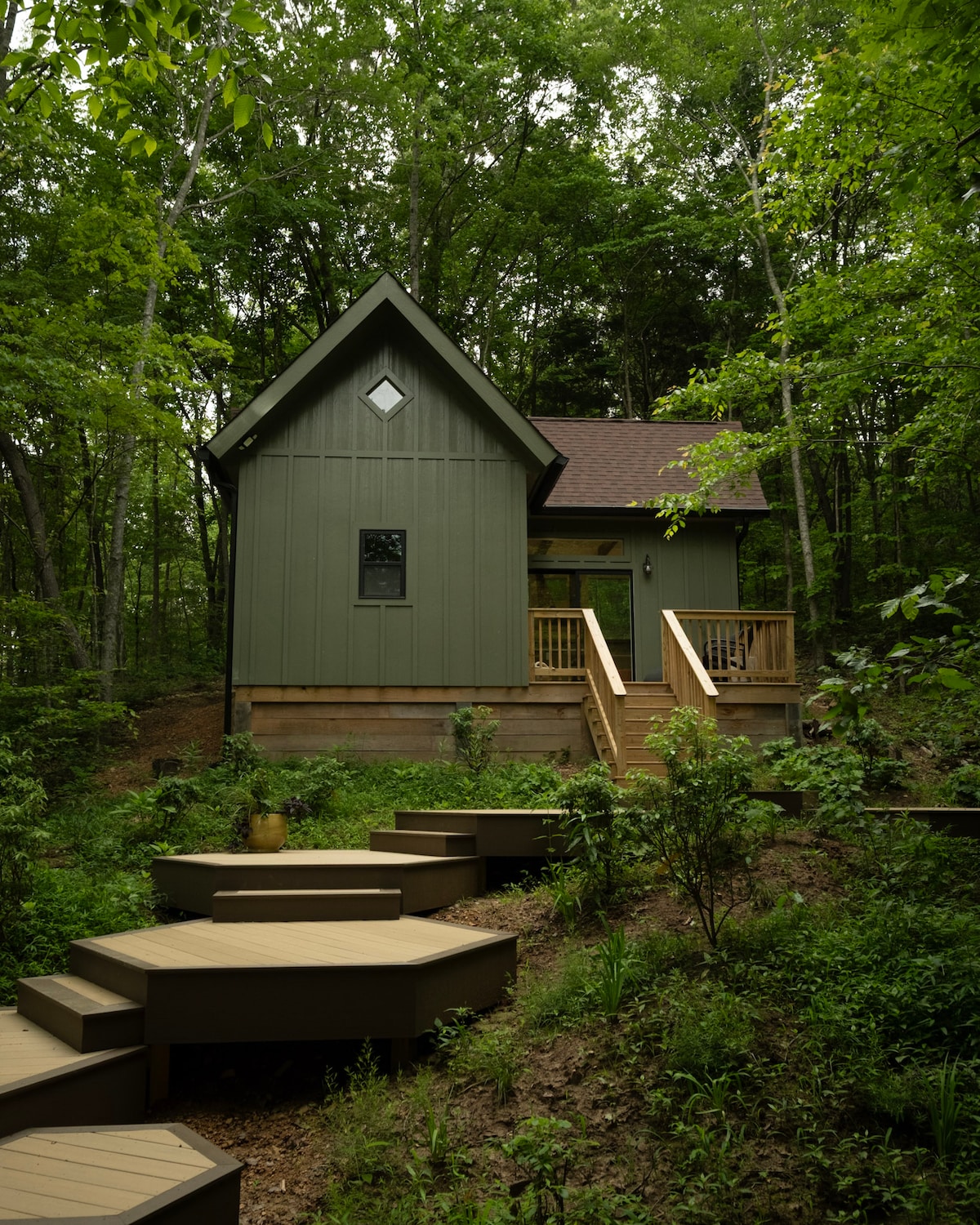 Rooted is one of two custom built tiny cabins on the 42 acre Bask Retreat Center campus. In addition to running top tier retreats, we welcome overnight guests to UNPLUG, RESTORE + RECONNECT. This cabin features colorful paintings, custom cabinetry, beautiful lighting, and massive windows for soaking in the surrounding forest. Cozy, comfortable, and colorful vintage furniture, retro fridge, marble countertops, deep bath tub, colorful and lovely tile in bathroom and kitchen.