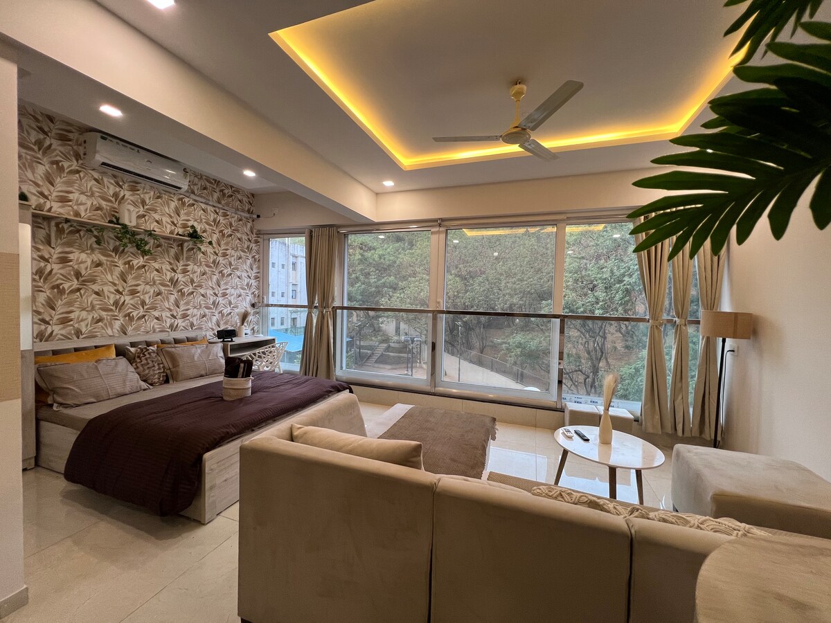 Balewadi High Street - Just 3.5 kms Mumbai-Bangalore Highway - 800 mtrs Looking for a peaceful home to come back to? Welcome to Casa Zen, a cozy yet spacious Zen-inspired studio apartment, where you’ll find a sense of oneness with nature in every corner. Curated with all my heart and soul, this space reflects my own zen, minimalist lifestyle. Wake up to the soothing sounds of birds and take in stunning forest views through large French windows, like a painting come to life.