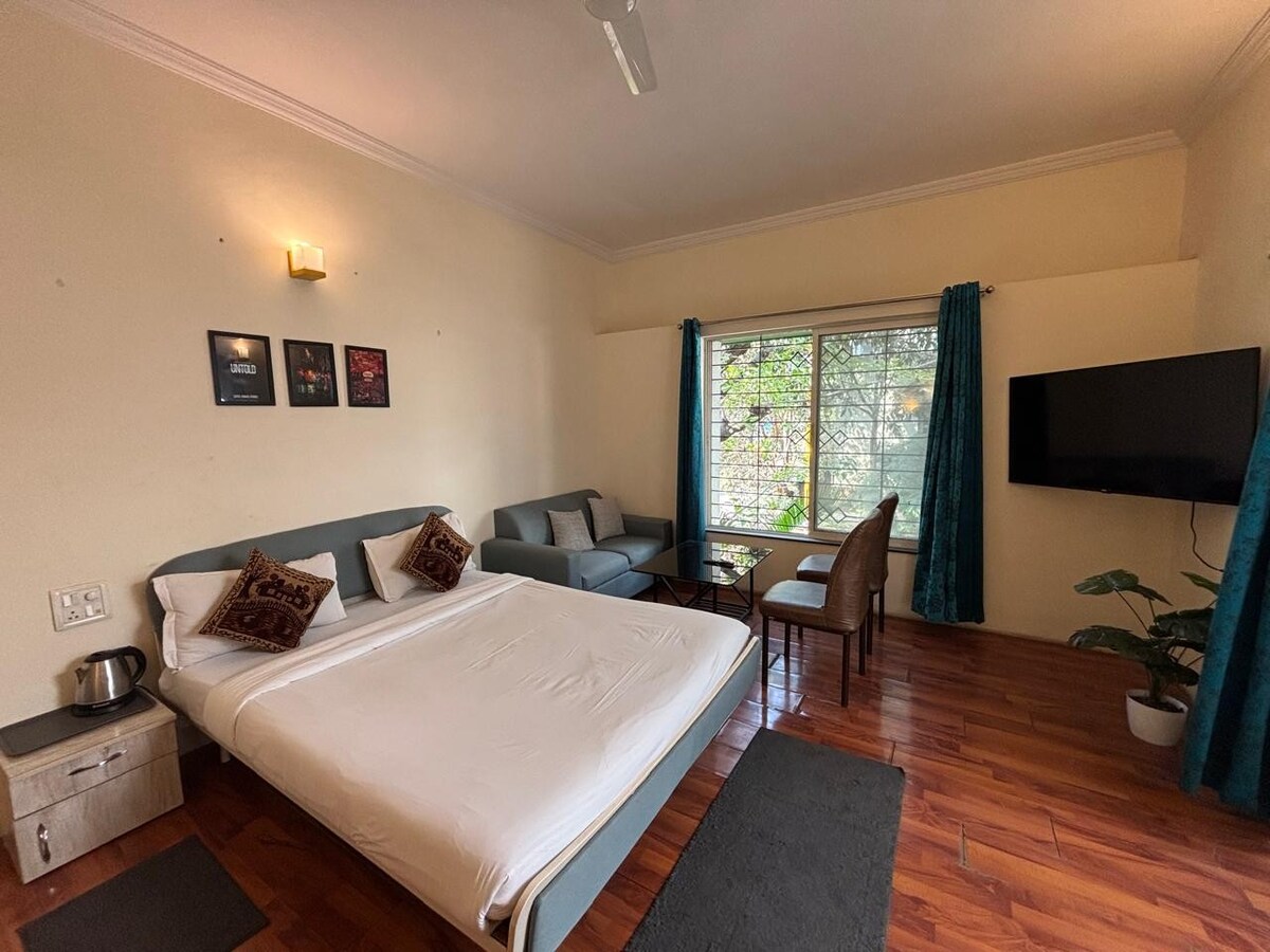歡迎來到您的完美假期! 這間寬敞、設備齊全的1 BHK公寓可欣賞Grand MCA Stadium和山丘的壯麗景色,以及9洞高爾夫球場。 無論你想在週末放鬆身心,還是遙距工作並入住更長時間,這個空間都能滿足你的一切需求。 公寓: *加大雙人床,配有記憶海綿床褥 *智慧電視 *設備齊全的模塊化廚房 *全自動洗衣機 *專供旅人使用的WiFi *全功率備用電源