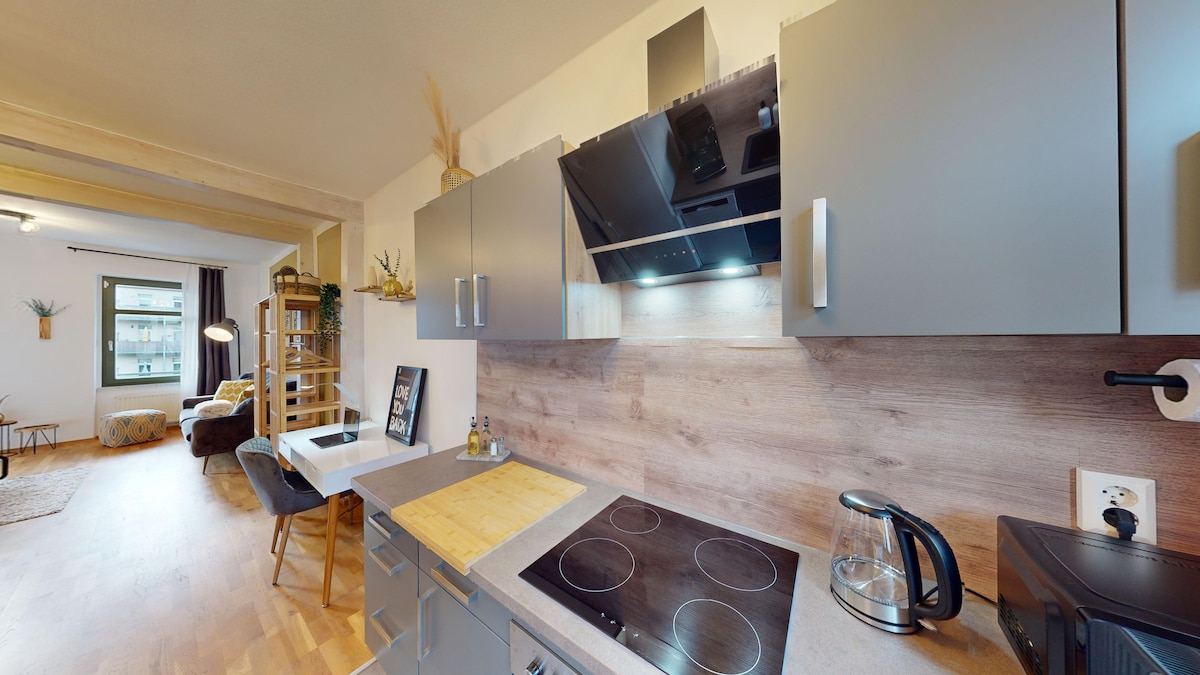 在這間寧靜、時尚的單間公寓中放鬆身心。 開放式平面圖創造了寬敞的氛圍,讓客廳、餐廳和廚房區域之間有著無縫的連接。 Hohenmölsen OT Granschütz是一個安靜的小鎮,與A9和A38高速公路有良好的連接 -開車35分鐘即可抵達萊比錫市中心 -開車45分鐘即可抵達哈雷市中心( Saale ) -開車25分鐘即可抵達Leuna