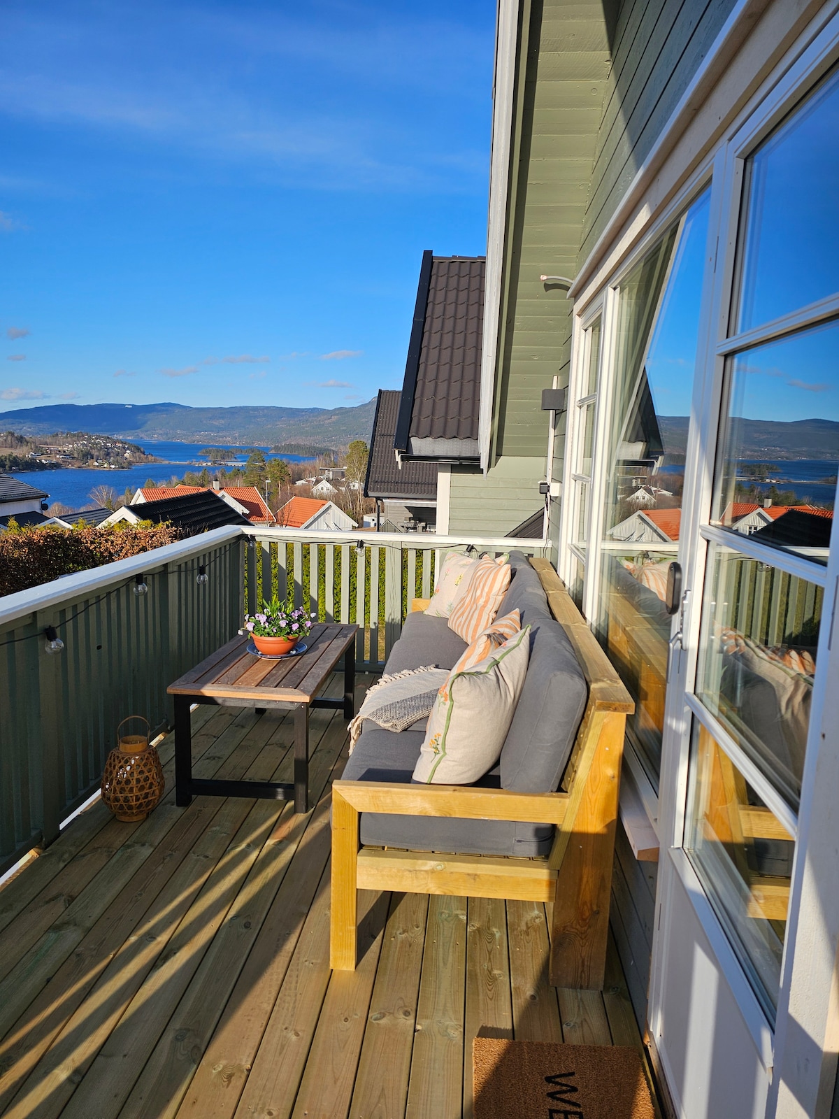 Our house is situated 40 minutes from Oslo on the way to Bergen. It has a magnificent view over two fjords. The house has 3 bedrooms, one double room with a double bed, one 10m2 single rom, and one tiny single room.. The outside has a patio with good space for 4 people for a good meal or the morning coffee. The house has a heat/cool pump in the ground floor that controls the livingroom /kitchen You have the whole house for yourselves, but we live next door if it is any questions. Welcome