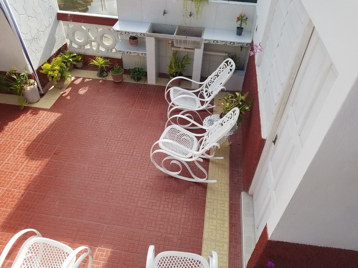 Disfruta de la sencillez de este alojamiento tranquilo y céntrico, que cuenta una cama matrimonial en cada una de sus dos habitaciones. Localizado en un tercer piso y completamente privado. A solo minutos del centro del pueblo caminando ( a 10 minutos del parque Calixto Garcia y la Bodeguita del Medio). Con vista de la Loma de la Cruz desde el balcón. Amplia variedad de Paladares/Restaurantes cercanos a distancia que puedes caminar.