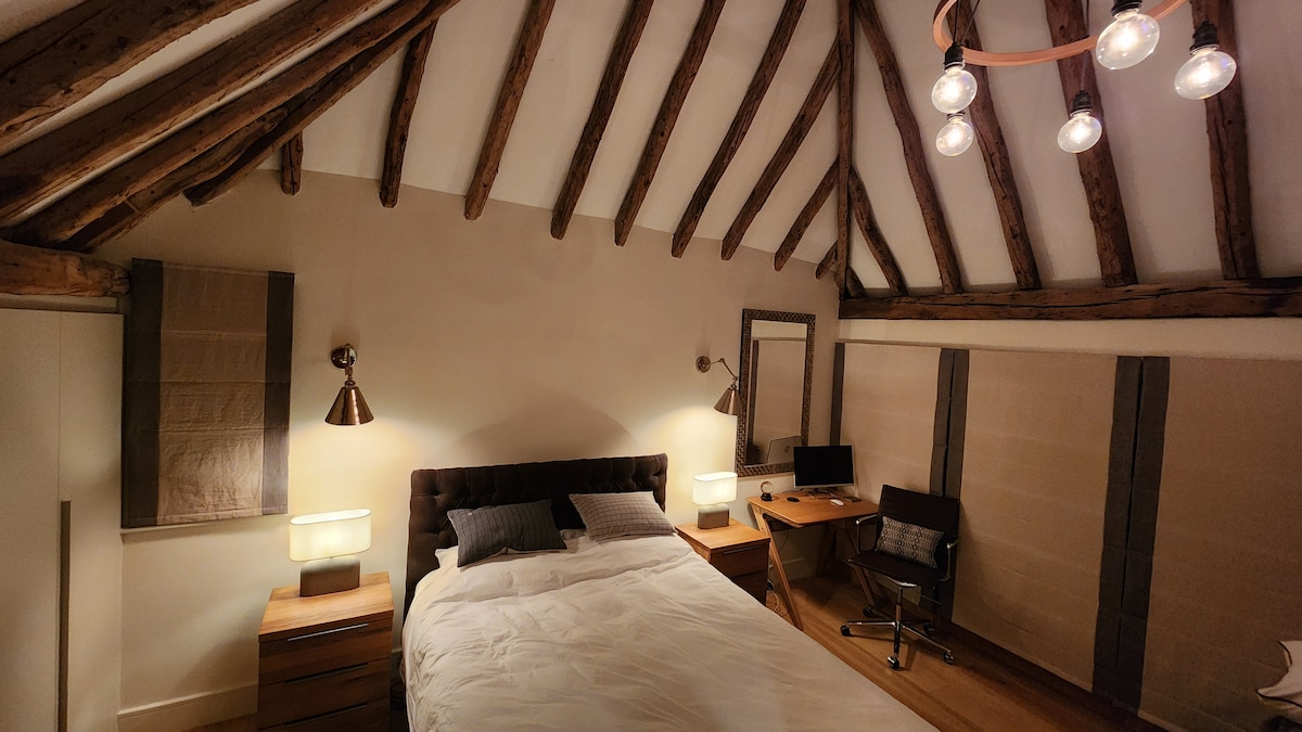 橡木框小屋翼樓的客用套房。 坐落在兩個風景如畫的村莊Old Basing和Newnham之間的農田上。 配備燃木爐的迷人客廳 寬敞的花園和露台,配有遮蔭的陽台和傢俬 提供簡單的DIY早餐 獨立入口 特大牀 探索漢普郡的鄉村花園和房屋的好基地。 方便前往倫敦、溫徹斯特、法納姆、溫莎、海克利爾 請注意地點,需要車輛-步行35分鐘即可抵達村莊和商店2.5英里+