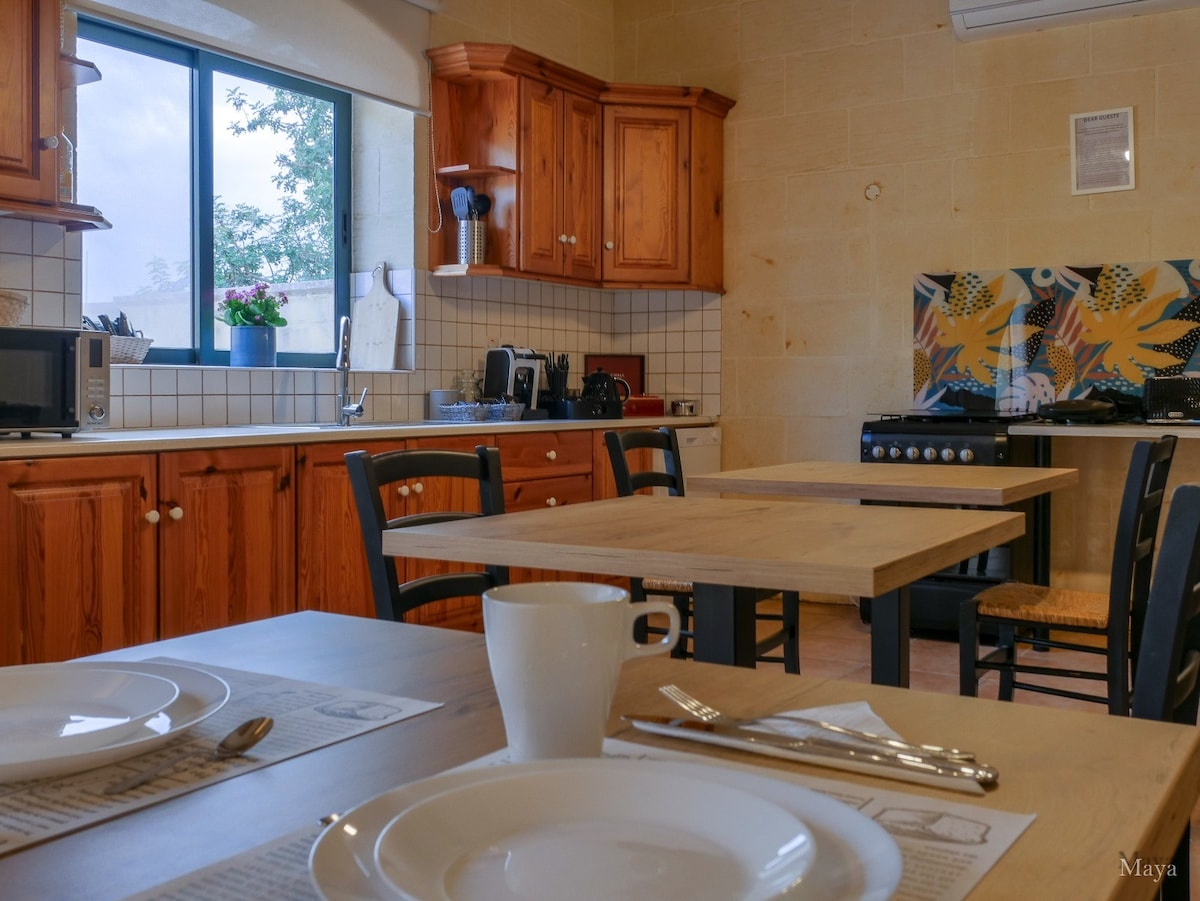 Nestled between the picturesque Gozitan landscapes, in the charming town of Qala, you will find this cosy maisonette which is sure to give your stay that extra bit of magic. The maisonette was built in typical Gozitan style which boastfully displays the honey coloured limestone found in the Maltese Islands and holds within it beautifully locally crafted wooden furniture which gives the whole place a rustic feel. It is filled with natural light and flaunts spectacular views of Gozitan countryside