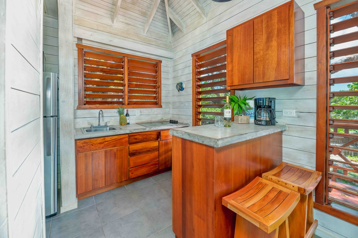 我們很高興再次為旅客提供獨特的小屋。 最近翻新( 2023年6月) ,配有新的茅草屋頂、新鮮的油漆和愛。 Grass Shack是一個放鬆的空間,有高天花板、一張大號床、獨立浴室、舒適的沙發、工作空間和一張舊的搖椅,可讓您放鬆身心。 它有一個私人露臺,歡迎房客使用我們的小泳池降溫。