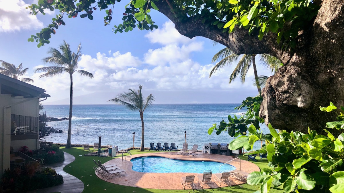 *Available for booking! Thankfully, our condo is not located in the wildfire affected area* Enjoy breathtaking panoramic views in this remodeled oceanfront corner condo located on Kahana Beach! With floor-to-ceiling windows in both the living and bedroom, gentle breezes and sunsets can be enjoyed lounging on the couch or relaxing in bed. Imagine falling asleep to the lull of ocean waves at your feet and waking to spouting whales in the background. Truly an oasis on the Valley Isle.