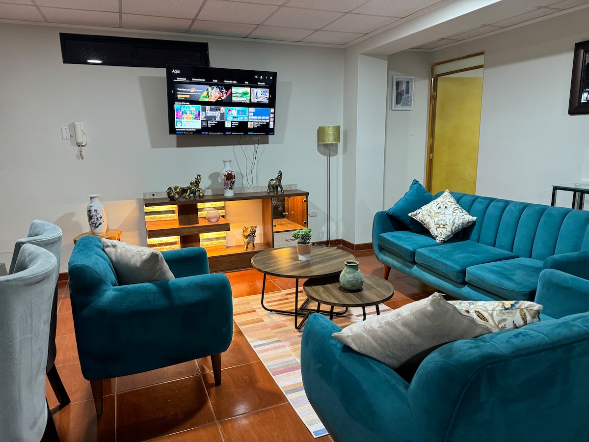 我們的行政套房位於Huancayo市中心,非常適合尋找溫馨氛圍的遊客和高層,他們的安全和舒適度是主要的。 我們有WiFi有線電視、Netflix、迪士尼、HBO Max ,小廚房q配有迷你吧、烤箱、攪拌機、水壺、廚房用具。 除了熱水和24小時保安 我們為您的健康制定了所有衛生規則 該地區的機場接送服務、洗衣和旅遊資訊。