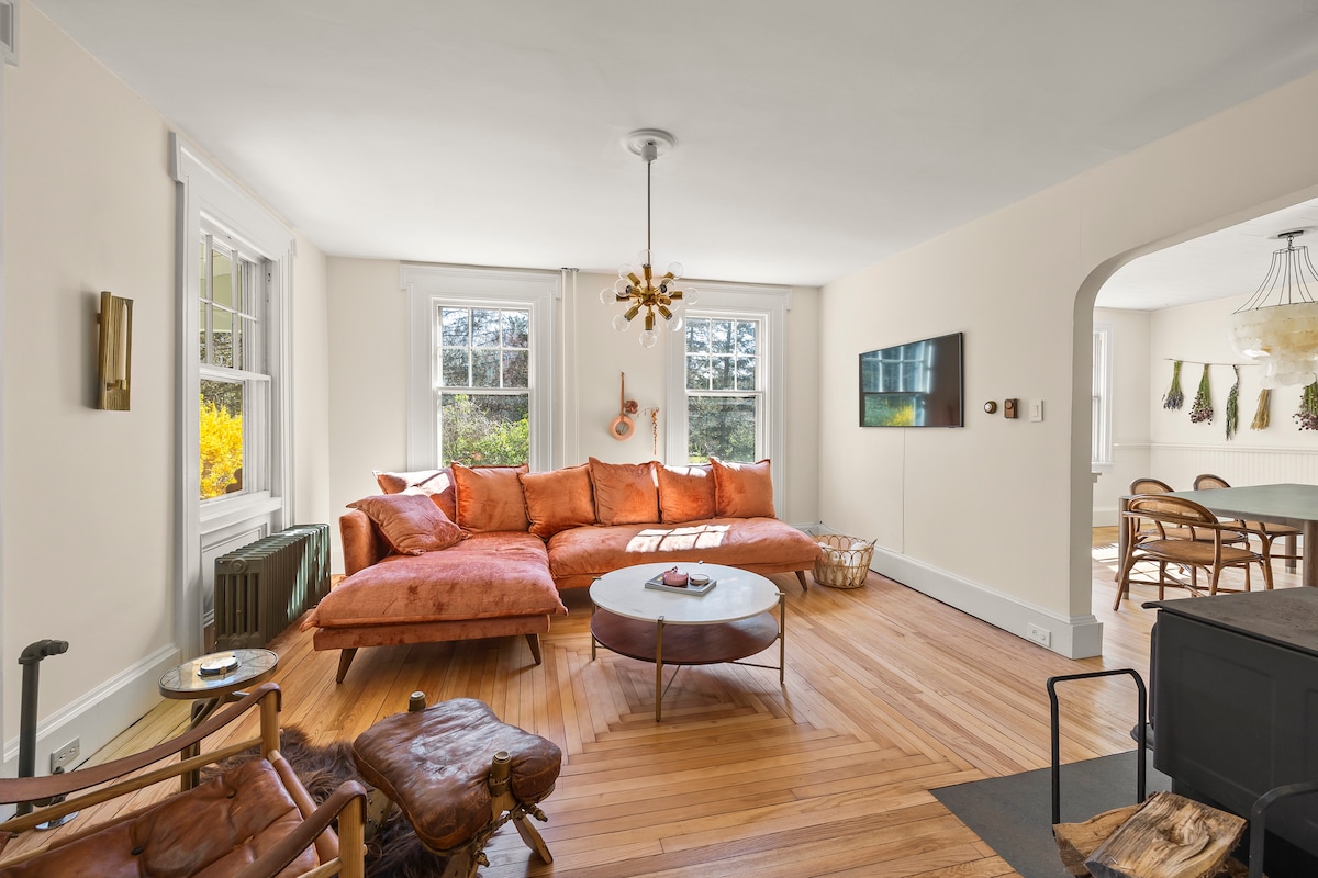 1873 Stylish & cozy Hudson Farmhouse w/ a wood burning stove & the perfect porch. 14 minute drive to Warren St This 3 bedroom + office home has been lovingly updated while maintaining the original details of this historic property. Located on over an acre of land, on a quiet street, this peaceful retreat is the perfect escape to unwind and relax. With high ceilings, tons of oversized windows, and an open layout, this house feels both airy & bright.