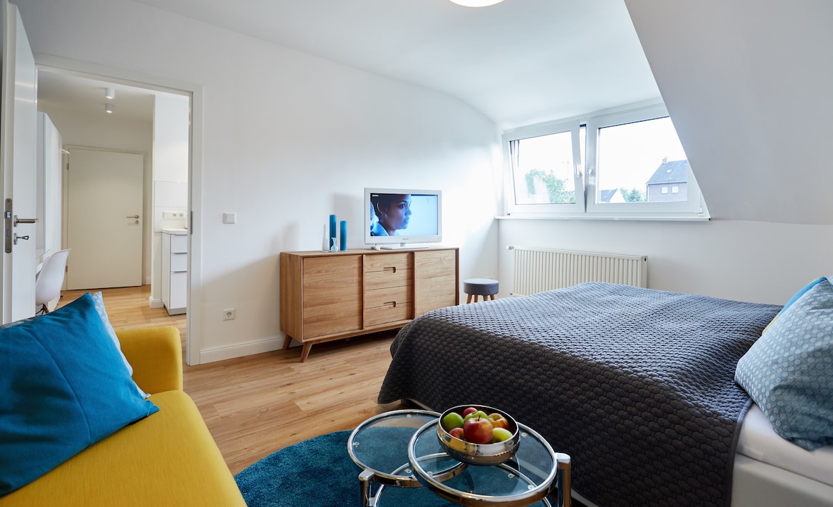 這間一房公寓位於我們 1957 年建造的房屋車庫中。我們在 2021 年對其進行了全面翻新,並在過程中擴建了住宿。它距離城市森林僅幾分鐘的步行路程。這裡有美麗的慢跑路線、新設計的遊樂場、船舶租賃和啤酒花園,讓您流連忘返。步行即可抵達克雷菲爾德市中心。即使街道看起來不像,但出奇地安靜。