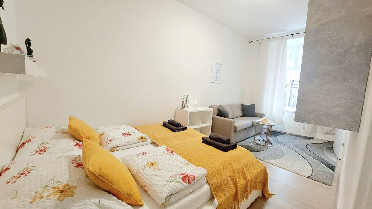 歡迎來到我精心設計和正式註冊的公寓。 你住在靠近市中心的一條僻靜街道上。 臥室和客廳充滿陽光,廚房可俯瞰安靜的花園。 帶廁所的浴室和廚房很小,但很新。 高速WIFI、智慧電視和工作站是標準設施。 步行15分鐘即可抵達維也納市中心。 5分鐘內即可抵達地鐵、餐廳和商店。 4歐元/天的停車場就在附近。