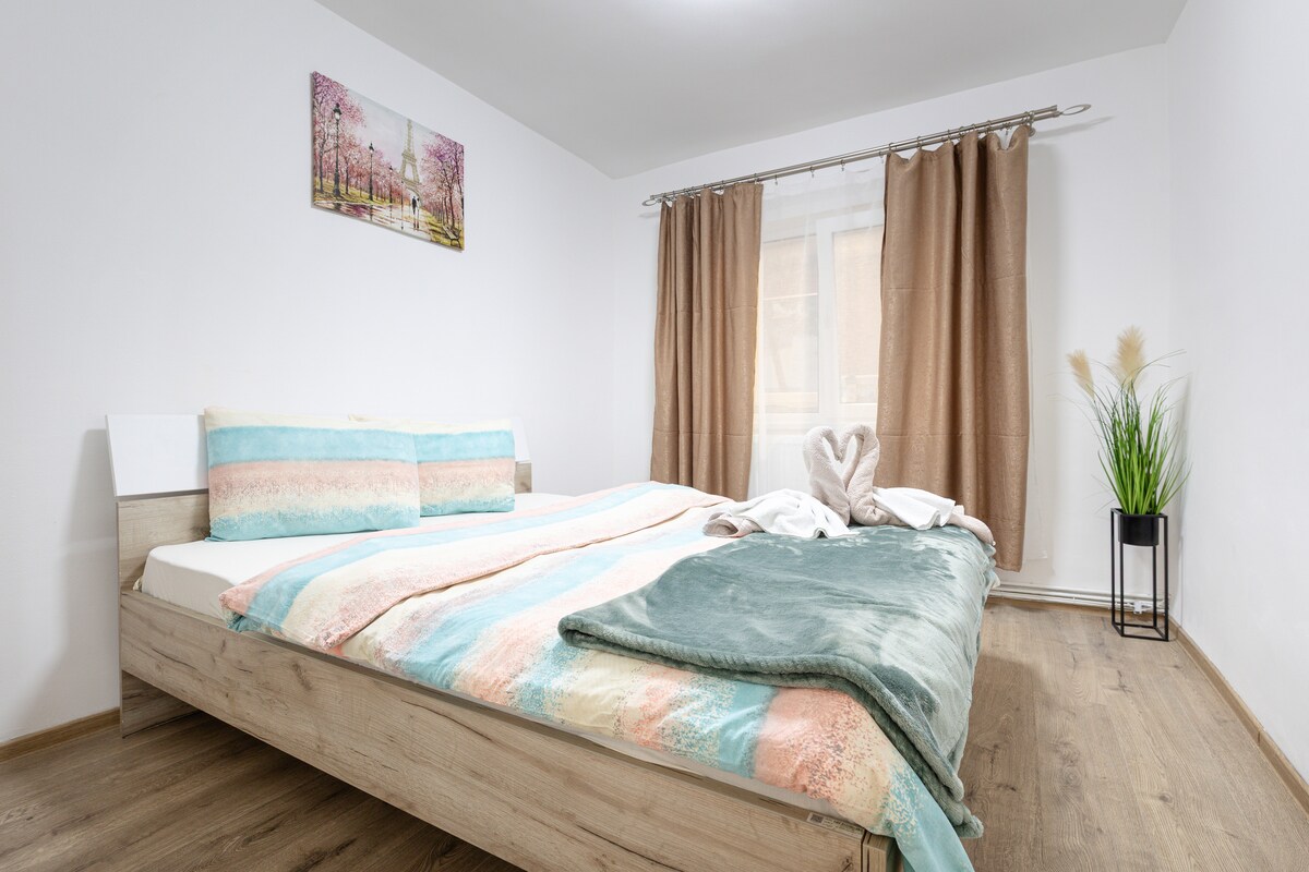 Enjoy comfort and relaxation in the Apartment - Modern Escape Cetate in Alba Iulia! Ideal for families, couples, solo travelers, or business stays! It is located in a quiet area close to the Alba Carolina Citadel (12 min. walk) The apartment offers: Comfortable King-size bed, modern and elegant bathroom, quality towels and bedding, High-speed WiFi, 139 cm Smart TV, fully equipped kitchen, free parking, balcony with view, and a sofa bed in the living room suitable for additional guests.