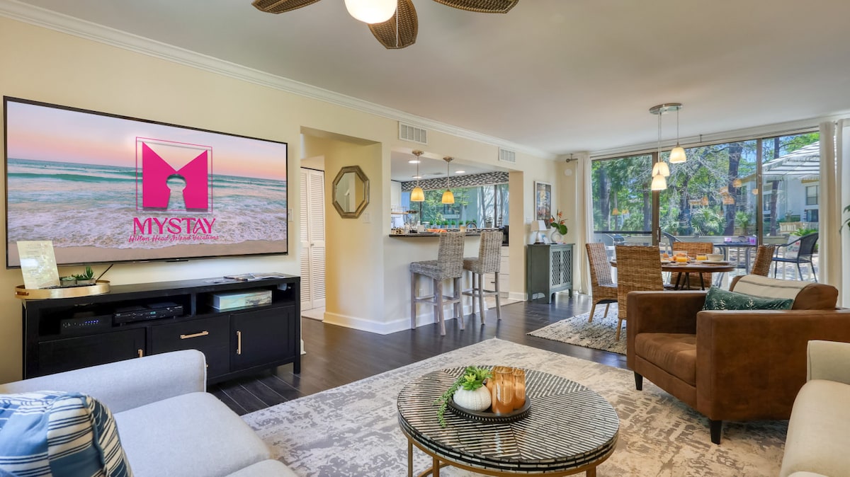您的寧靜時尚的公寓位於希爾頓黑德島的隱藏寶石海灘上,擁有自然景觀、郁郁葱葱的景觀、3個泳池、按摩浴池和網球場。這間新翻修的2床/2浴室單位,可欣賞潟湖和海景,配有遮蔭的日光浴室、全新LG電器、石英櫃檯、備品充足的廚房、單位內洗衣房、客廳配有65吋電視、臥室配有58吋/55吋電視、海灘裝備(推車、雨傘、玩具)、400 MB網路,且無需支付清潔費!