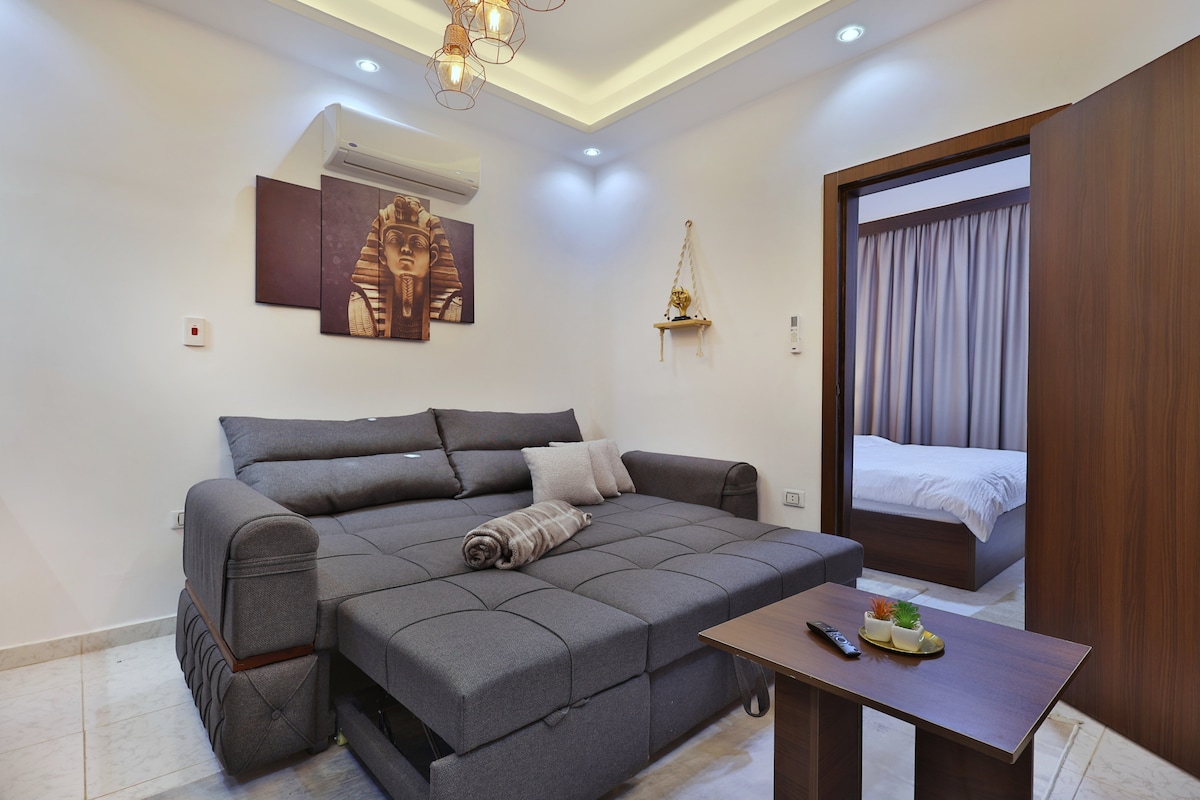 Enjoy a stylish and romantic experience at this centrally-located place. In front of Dream Beach, only 50 feet from Hurghada touristic Villages Street Modern furniture with a very speed Wifi, Netflix and youtube This apartment contains special kitchen equipments, Microwave, Washing machine, Turkish coffee automatic machine, kettle and full coffee and tea complement Also Iron and ironing board and a desk for Remote working Romantic one Bedroom for lovers and one Sofa Bed