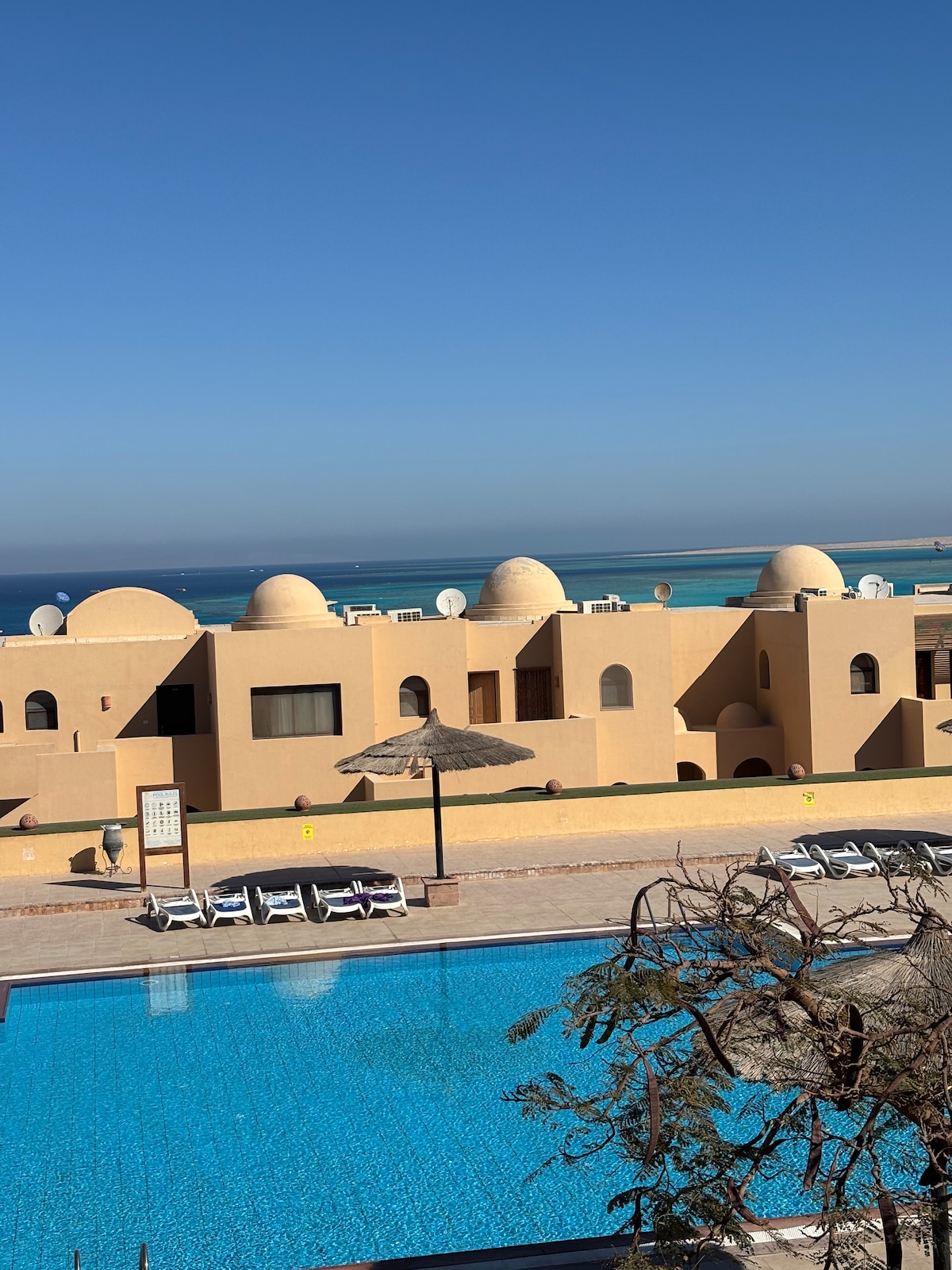 Relax in our cozy sea-view studio in central Hurghada, right by the Red Sea. Perfect for couples, solo travelers, or small families looking for comfort, great location, and resort vibes near the city center. What You'll Like: Free private beach and swimming pool access Red Sea and pool views from your private balcony Prime location on Old Sheraton Street – close to cafes, shops, nightlife & supermarkets Free Wi-Fi, 24/7 security & on-site parking Complimentary shuttle bus within the resort