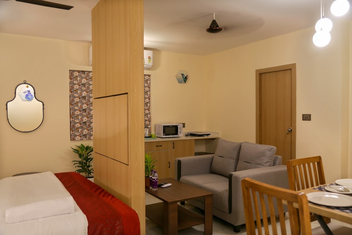 BLUO STAYS -屢獲殊榮的房源! 寬敞的設計師1BHK ( 520平方英尺) ,配有Gachibowli的露臺花園,適合單人高管/情侶,靠近Hitech City和Jubilee Hills。 最適合居家工作:臥室內有雙人床、工作桌、浴室、客廳內有沙發座位和餐桌,以及配備燃氣爐、冰箱、微波爐、炊具等的全功能廚房。 全包式日租服務:WiFi互聯網、Netflix/Tatasky電視、清潔、洗衣機、水電瓦斯、停車位、100%電力備份