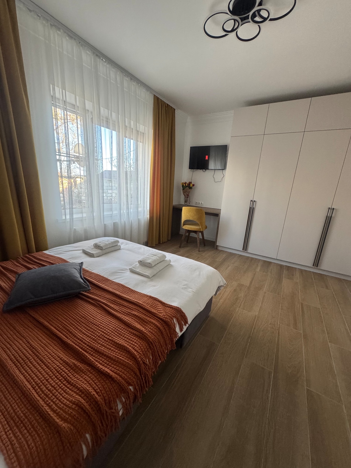 位於基希訥烏市中心的時尚舒適公寓,非常適合商務差旅和情侶入住。 享受城市全景、寧靜的氛圍,並可輕鬆前往各處。 你會喜歡🛋️的地方 • 舒適的特大床 🛏️ • 明亮的客廳,配備沙發床和智能電視 📺 • 設備齊全的廚房 + 餐廳 🍽️ • 現代化的步入式淋浴間 🚿 •洗衣機和烘衣機 🧺 • 高速WiFi ⚡ 位於基希訥烏市中心,鄰近公園、餐廳、咖啡館和主要景點。 輕鬆前往市內任何地方。