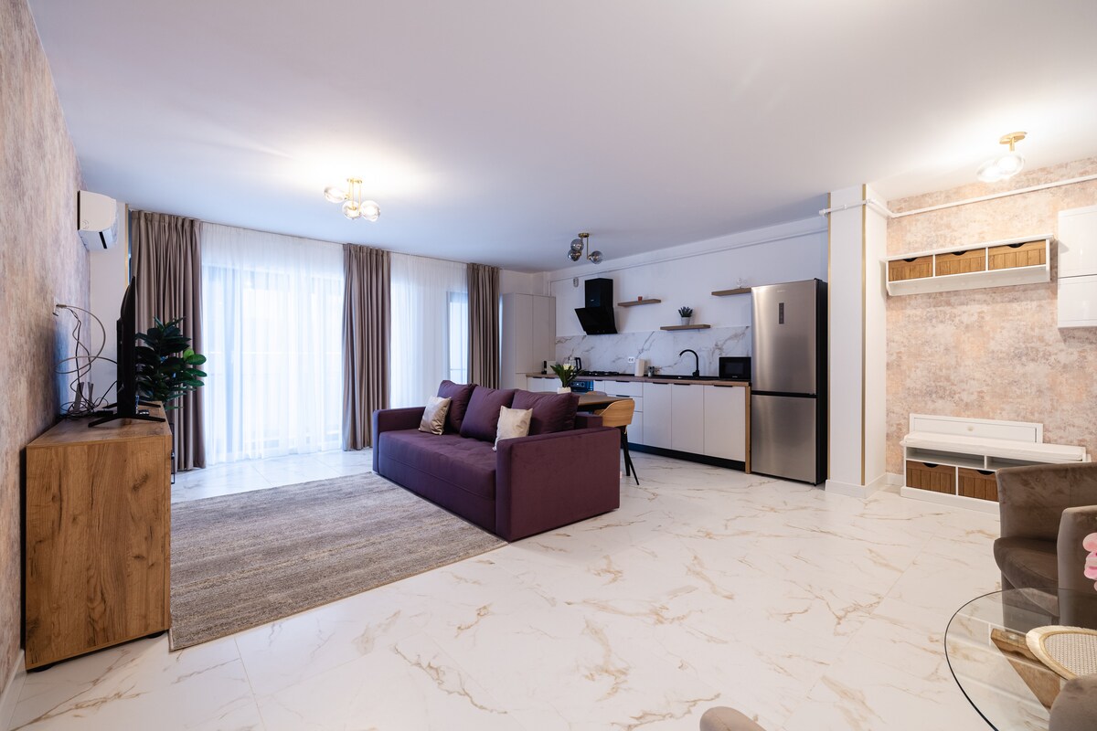 房源位於市中心,有私人停車場。 公寓寬敞( 60平方米) ,有特殊的設計和獨立浴室。 設施: WIFI、可收看Netflix和Amazon Prime Video的電視、空調、設備齊全的廚房、洗衣機、吹風機、急救箱、滅火器。 房客在我們的地點Piata Unirii Cafe和Tiki Bistro餐廳享有15%的折扣,並可以選擇早餐、點菜單或送房。