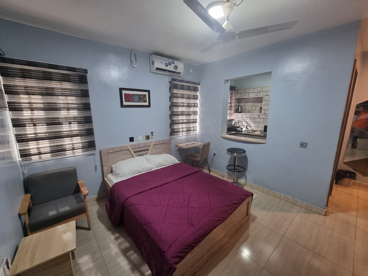 Beautiful & well ventilated self-contain premium serviced apartments are available for short let in a serene and secure environment just 5 minutes drive to the University of Ibadan. Facilities include; 24 Hour Solar Inverter Power Supply, Wardrobe, Air Conditioning, en-suite bathroom furnished kitchen with Microwave Oven, Inverter Refrigerator, Treated Water supply, Free laundry CCTV Permanent 24-hour security guard, Electric fencing system & Spacious car park Wifi is under maintenance