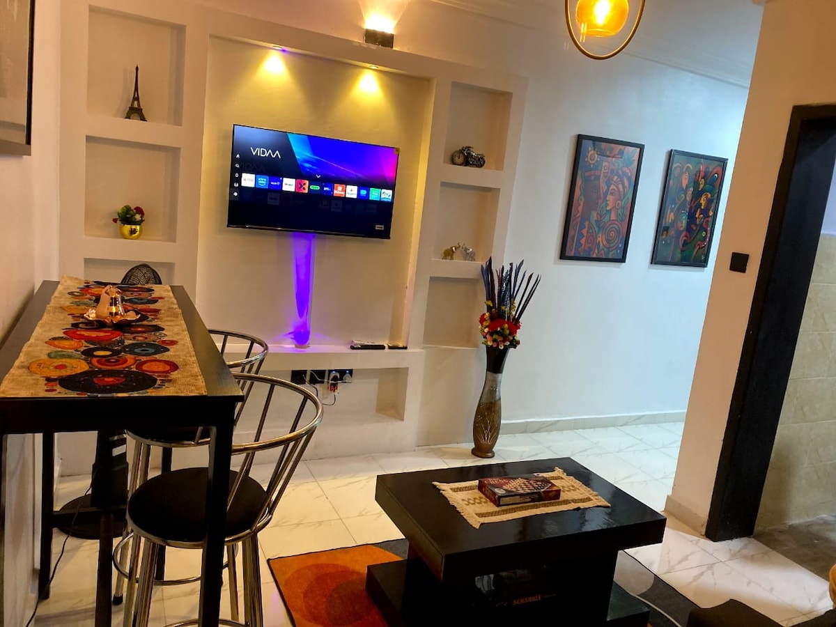 這間優雅的2房公寓位於Lekki最綠色和最安全的地產之一,適合家庭入住,讓您體驗精緻的舒適。 享受無縫連接—10分鐘即可到達Shoprite、Blenco、Yakoyo和新的海岸路,距離LBS僅15分鐘路程。 旅人可享受設有門禁、預先批准的出入權限、寧靜的環境,以及包括迷你超市和藥房在內的物業內設施。