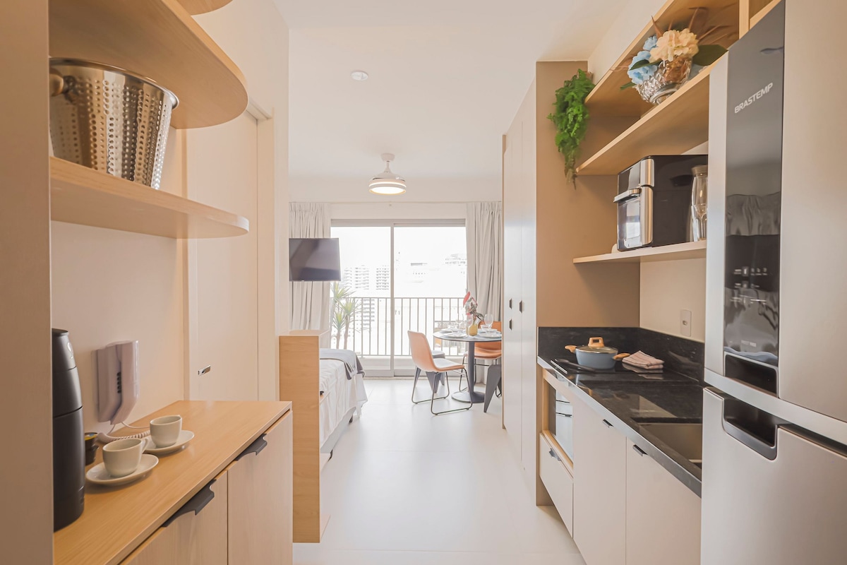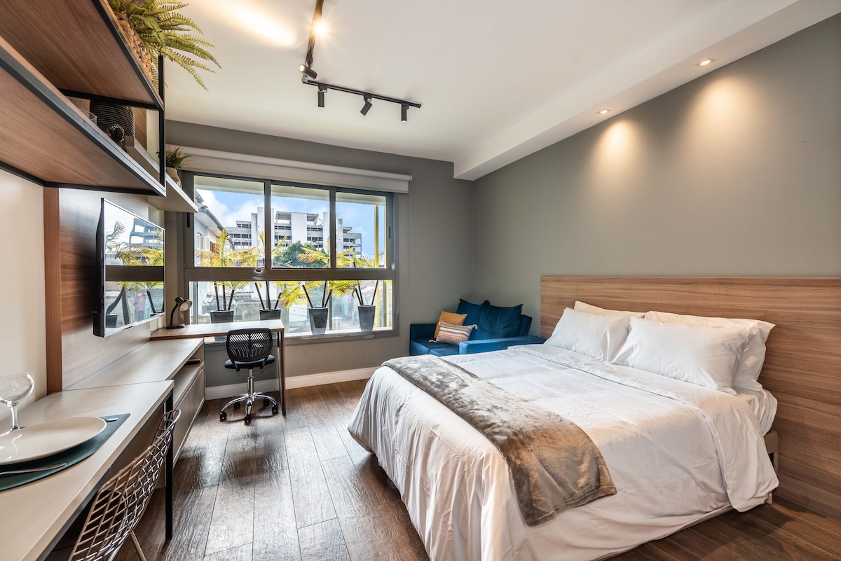 Compact and functional, the studio has everything you need for a comfortable stay. It features air conditioning, a Smart TV, and Wi-Fi. The compact kitchen is fully equipped with a cooktop, oven, refrigerator, microwave, and all necessary utensils. Bed linens and towels are also included with your stay. Check-in is available through a digital lock. The building offers 24-hour security and amenities such as a laundry service (additional charge), a swimming pool, and a coworking space.