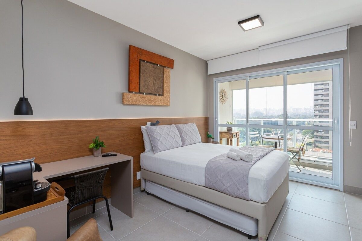 Studio novo em Moema , decorado em grande estilo , luz indireta , mesa de refeição, bancada de trabalho cozinha completa com cooktop , geladeira , microondas e cafeteira , internet e TV smart , varanda anexada , cortina blackout , 11° andar . Armários finos . Prédio com lazer completo, espaço de coworking , piscina , salão de festas , lavanderia , mercado autônomo . Na quadra do metrô Moema . Estacionamento em frente conveniado . Prédio novo . Fornecemos todos os itens de enxoval e cozinha.