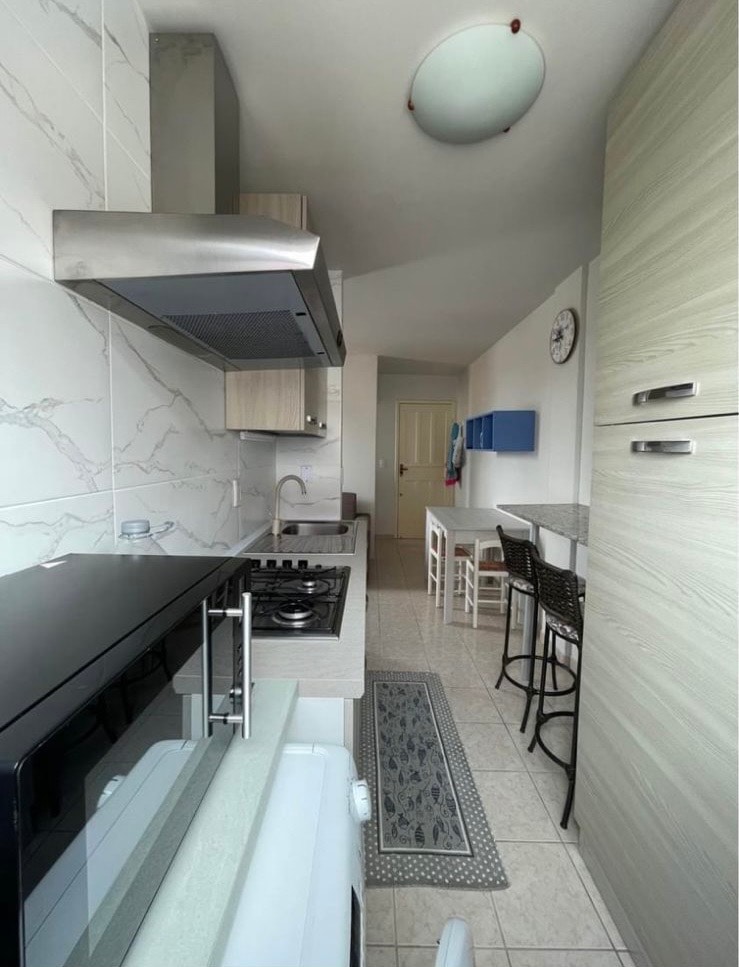 2 quartos, garagem. organizado, limpo, com TV, Ar-condicionado no quarto principal, lavanderia com máquina de lavar e tanque, cozinha completa com forno micro-ondas, forno elétrico, fogão, churrasqueira (dependendo do número de diárias, consultar). No quarto principal há uma cama King e no outro quarto possui duas cama de solteiro. Na cozinha possui talheres, pratos, xicaras, cafeteira, panelas, copos etc. Roupa de cama, mesa e banho estão inclusas. Fica no 2° andar e não possui elevador.