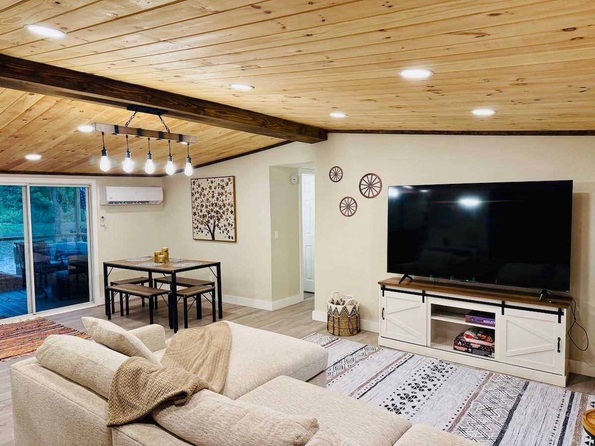 Keep it simple at this peaceful cabin….Centrally-located to Itchetucknee Springs, Ginny Springs, Poe Springs, Blue Springs, Santa Fe River, Suwannee River. This area is popular for diving , snorkeling, boating, fishing, kayaking, tubing and hiking or just relaxing with nature. Full kitchen, living room and separate bedroom with a comfortable queen bed and walk-in closet. A large bathroom with walk-in shower. Wi-fi throughout. 42” smart tv in living room, 32” smart tv in bedroom.