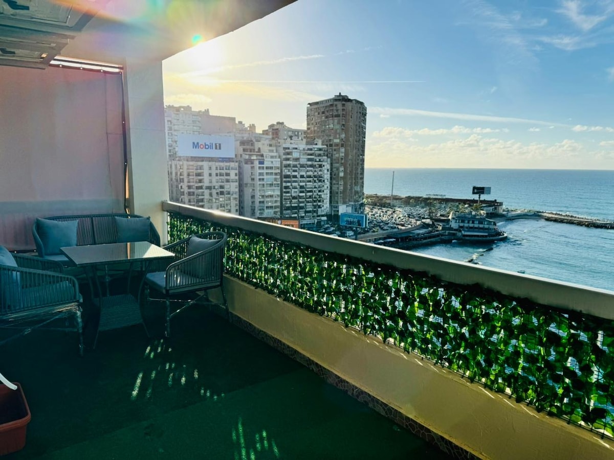 亞歷山大市中心時尚屋頂公寓,可欣賞壯麗的海景。 享受俯瞰地中海的私人露台、現代裝飾和舒適的環境。 距離咖啡館、餐廳和海濱大道(Corniche)僅幾步之遙。 明亮、設計精美的室內裝潢,配備Wi-Fi、冷氣和所有必需品。 非常適合希望在城市中享受最佳景觀的情侶或旅客。 從高處俯瞰亞歷山大!