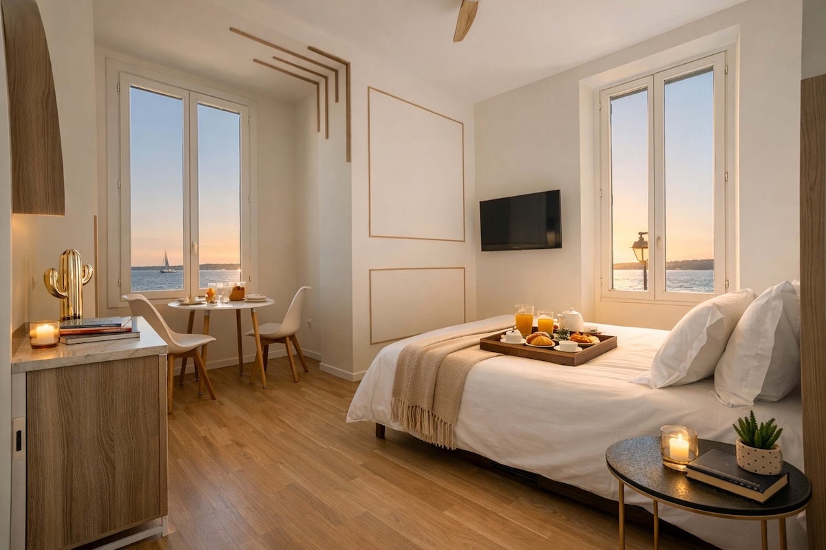 Architect-designed, 4-star sea-view apartment in the heart of Cannes, balcony overlooking the famous Félix Faure street. ✨Prime location: opposite the Palais des Festivals, port, beaches and the Croisette, just 2 min’ walk👣 🛍Surrounded by shops & restaurants 🛏1 bedroom (king-size bed) + premium sofa bed 🚿 1 shower room 🛜High-speed WiFi, Smart TV, Netflix, air conditioning, fully equipped kitchen (Nespresso), hair dryer, iron 🛁Bed linen, towels, soap, shampoo, coffee & tea provided 🔑