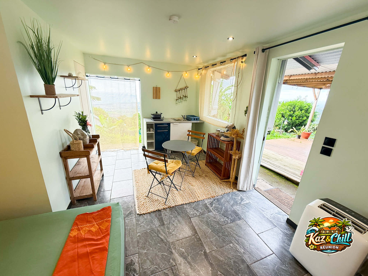 Dans villa 200 m d'altitude avec piscine chauffée : petit bungalow indépendant dans jardin (chambre parentale, lit double, salle d'eau, cuisine ext.). Accès partagé à une terrasse couverte avec une grande table, au jardin et à la piscine. Nous avons dans le jardin un chien charmant. Il y a un supplément de 6€ par nuit si vous êtes 2. Des commerces de proximité à moins de 10 min à pied. Saint-Paul centre à 20 min en voiture et plages à 30 min. Transports en commun possibles mais compliqués.