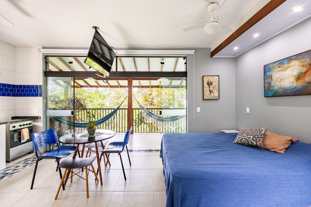 Charmosos estúdios self catering na linda praia do Prumirim. Entrada independente, pátio privado, cozinha totalmente equipada, cama queen size de alta qualidade, sala de estar confortável. Tudo projetado com qualidade, conforto e estilo. Grandes janelas panorâmicas que vão fazer você se sentir entre as copas das árvores! Este é um lugar mágico para quem procura uma fuga romântica à beira-mar conectando-se à natureza sem comprometer seu conforto. Tudo meticulosamente limpo, sanitizado e seguro!