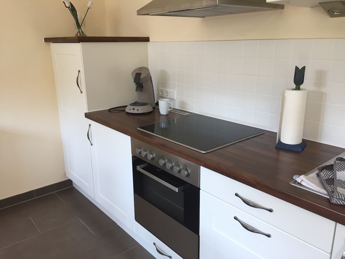 漂亮舒適的度假公寓,配有兩張床。可加床。公寓中心有一張大沙發可供休息。位於鄉村安靜的住宅區。我們很樂意提供早餐服務/麵包服務或購物服務。房子前面有停車位。還有一個小型戶外座位區。我們期待您的到來。歡迎光臨。