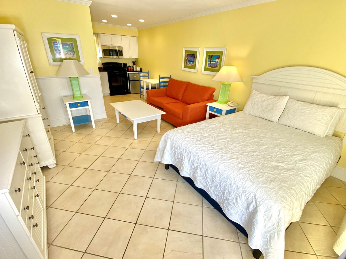 Small, Cozy Space-Big Value! Newly Remodeled End Unit Studio Steps From Sugar Sand Atlantic Beach One Queen Bed Fully Equipped Kitchen w/ Fridge, Stove, Microwave, Keurig & Drip Coffee Makers, Toaster, Blender, Pots, Pans, Utensils, Plates, Cups Modern Bath Free Wi-Fi Free Cable-TV Linens Included (Towels & Sheets) Free Parking Private Pool Access Charcoal Grill at Poolside (Bring Your Own Briquettes) Credit Card Laundry Facility next to Game Room. PLEASE NOTE: Beach Towels NOT PROVIDED