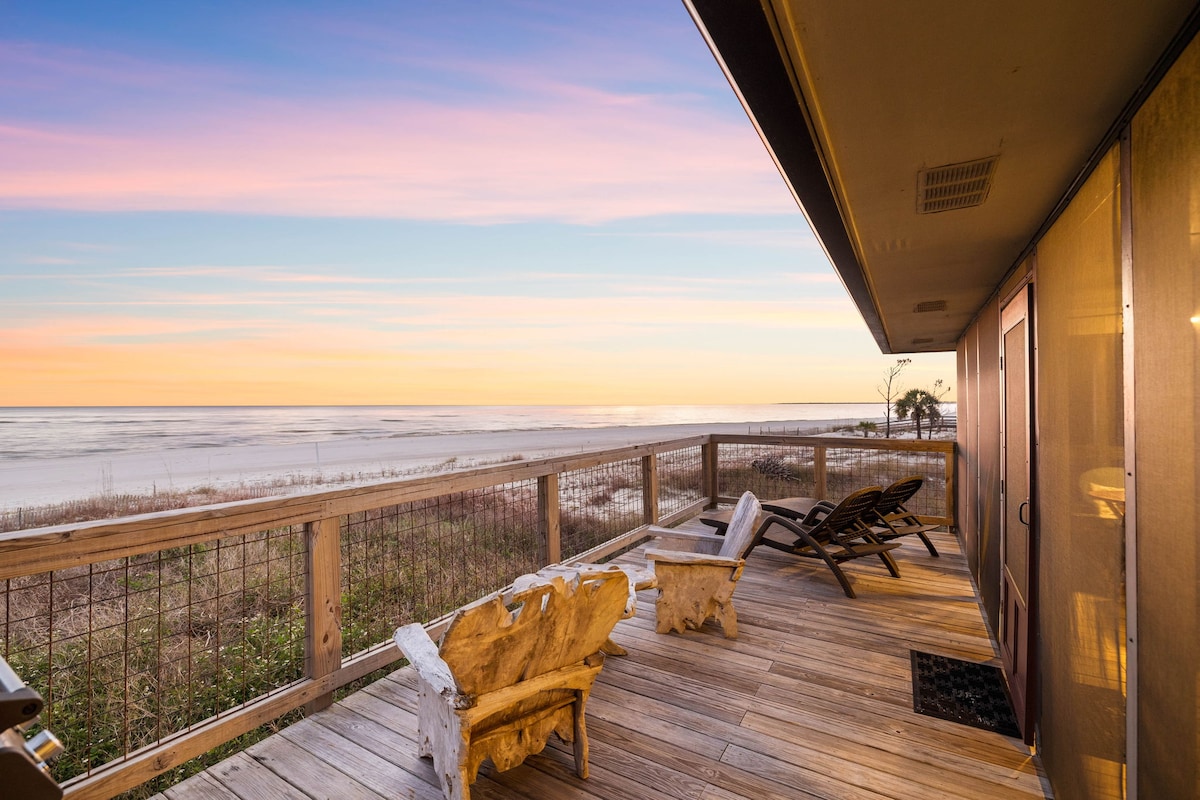 這間豪華海景出租屋位於墨西哥灣白沙之外,位於佛羅里達州聖喬港 佛羅里達州喬和佛羅里達州阿帕拉契科拉。布局為房客提供舒適和效率,確保盡可能放鬆的體驗。房源位於佛羅里達州北部一英畝的海岸景觀上。 從前面的門廊聽到和看到海灘,並在後面的門廊放鬆身心,安靜地聆聽州立保護區的貓頭鷹和其他野生動物。兼具兩者優點!
