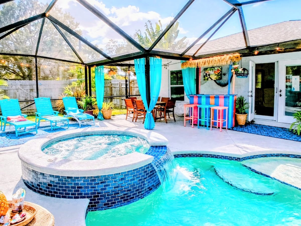 來享受這間靠近市中心和印第安河的美麗海灘別墅,開車前往大海僅需10分鐘。 房源設有大型私人螢幕加熱泳池、溢出式水療中心*和提基酒吧。 這間度假勝地配有兩張加大雙人牀、雙人牀、配有單人腳輪的雙人牀和沙發沙發,非常適合一個家庭或兩個家庭! 這裏廚房備有全套設備齊全,可供任何場合。 配備智慧電視,可連接到所有串流選項……