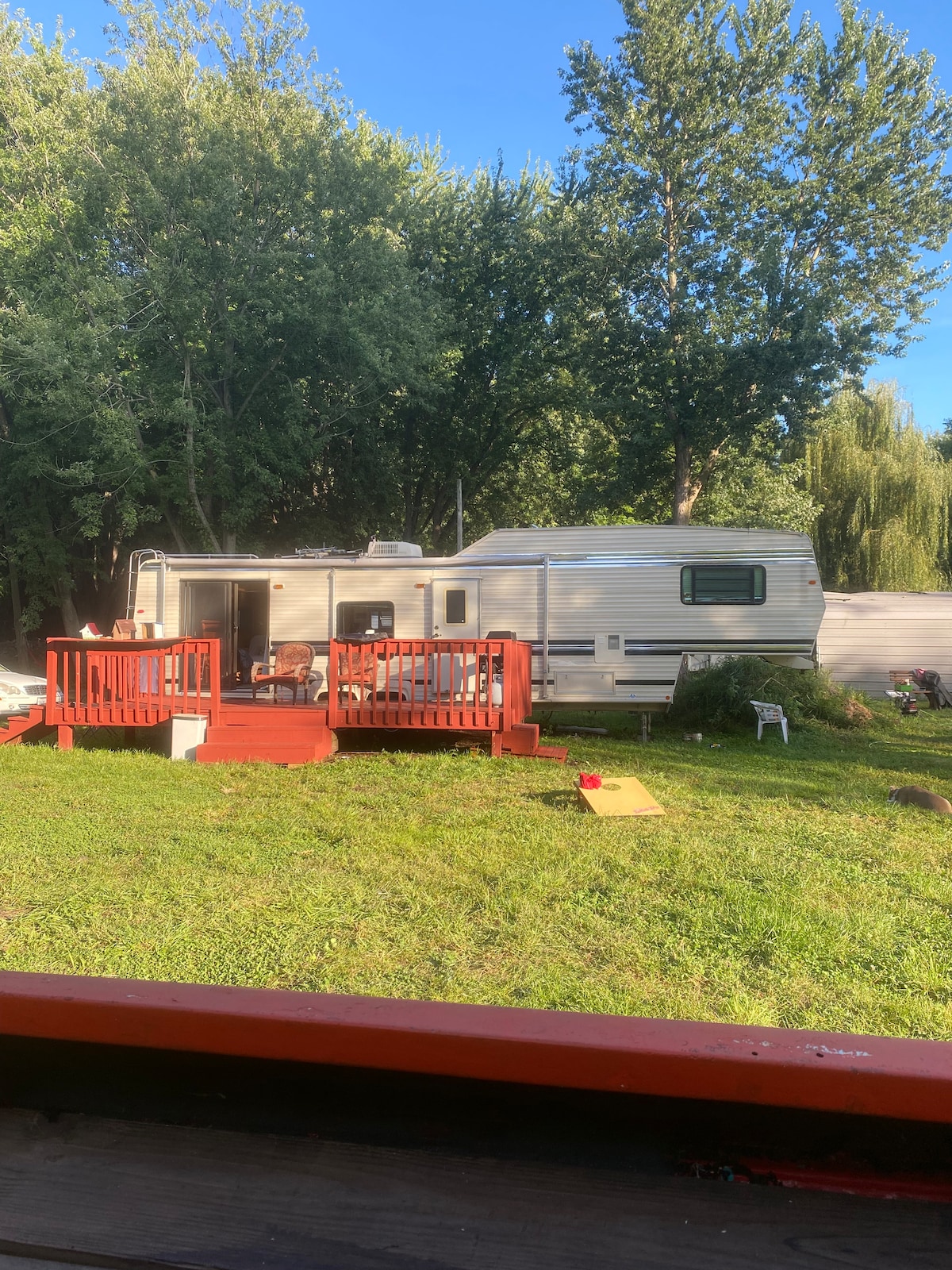 這輛露營車可欣賞俄亥俄河的水景,位於一個小型碼頭。我們有一個額外的遮蔽區域,有額外的淋浴間、鄉村戶外淋浴間、烤架和火坑。這輛特殊的露營車有自己的大露臺,配有桌子和烤架。我距離辛辛那提和路易斯維爾45分鐘,靠近奧羅拉、勞倫斯堡和印第安納州麥迪遜。我在鄉下,所以您至少要開車8英里才能到達雜貨店。Vevay和Warsaw Ky約距離8英里。