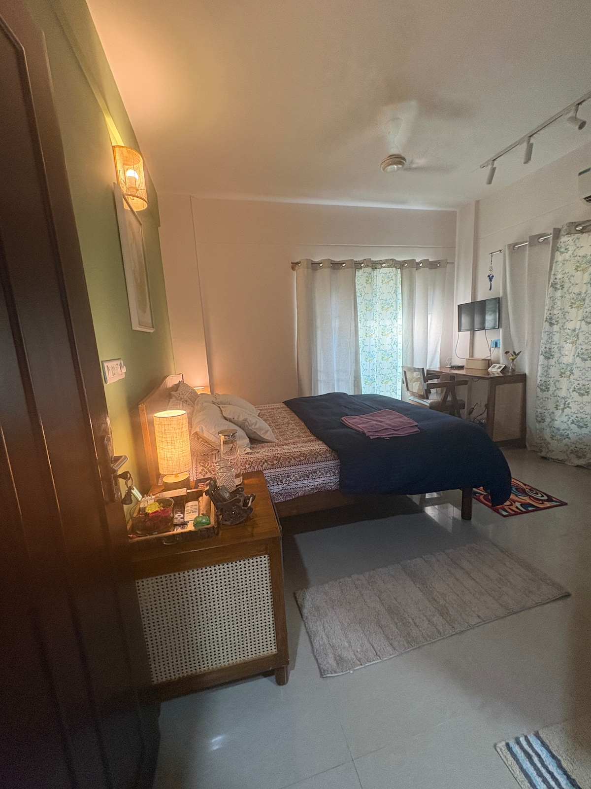 A spacious 1-bedroom studio in the heart of Indiranagar with a private balcony, potted plants, a mango tree, and a kitchen. Thoughtfully designed - minimal, homely style - filled with natural light and quiet charm. A 1 min walk from the metro and some of Bangalore’s best cafés. An extension of our calm way of life — ideal for solo travellers, couples, and work trips. Birds and butterflies often drop by to say hello. Includes King bed Wi-Fi+workspace Modern bath Kitchenette with essentials only